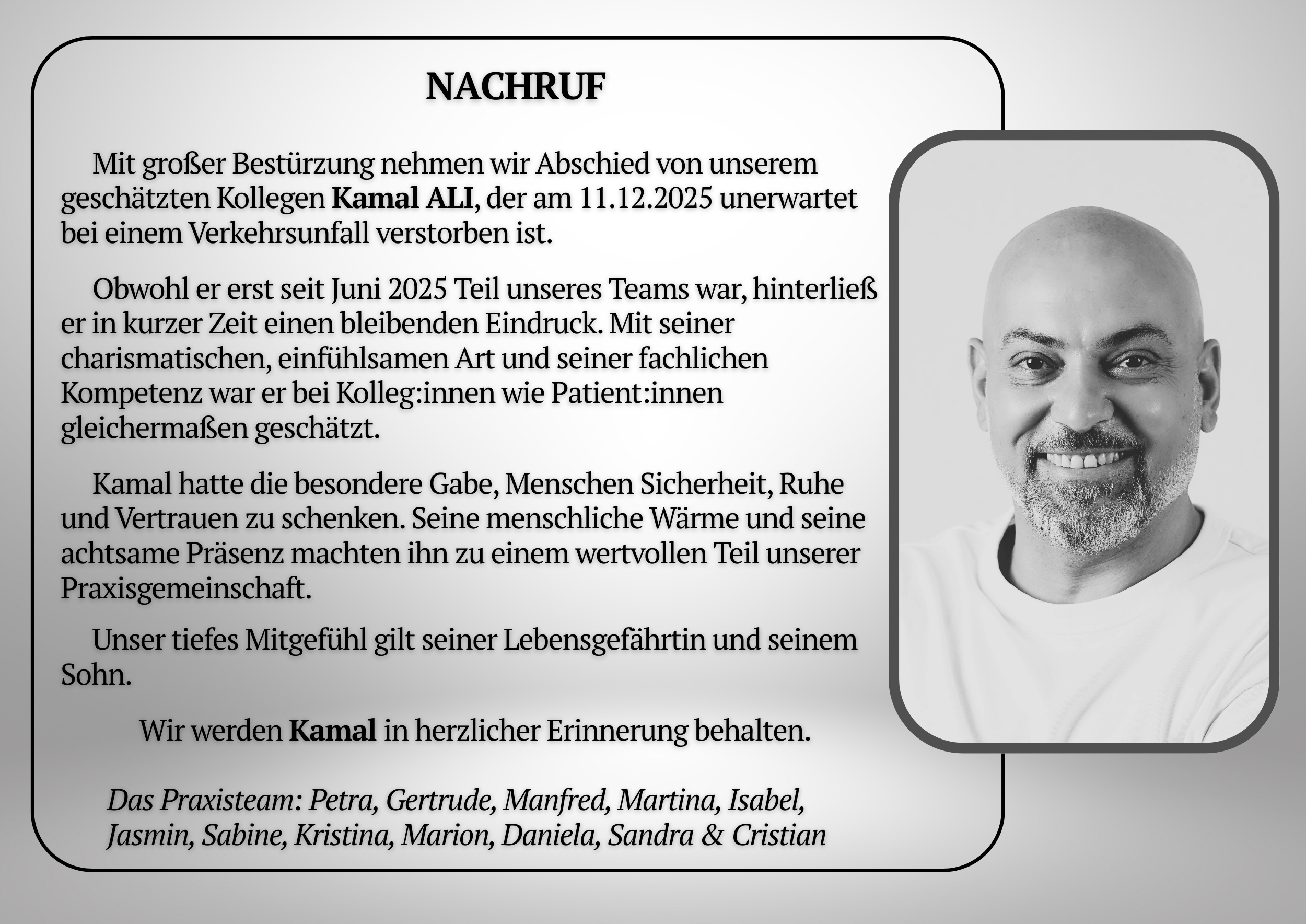 Tief betroffen nehmen wir Abschied von unserem Kollegen Kamal ALI. Unsere Gedanken sind bei seiner Familie und seinen Angehörigen.
